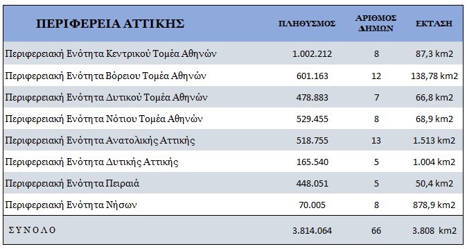 Η Περιφέρεια Αττικής είναι η μεγαλύτερη σε πληθυσμό Περιφέρεια της Ελλάδας, με 8 Περιφερειακές ενότητες, 66 Δήμους και 3.814.064 κατοίκους, που αντιστοιχεί στο 36,4% επί του συνόλου του πληθυσμού της χώρας σύμφωνα με την απογραφή του 2021.