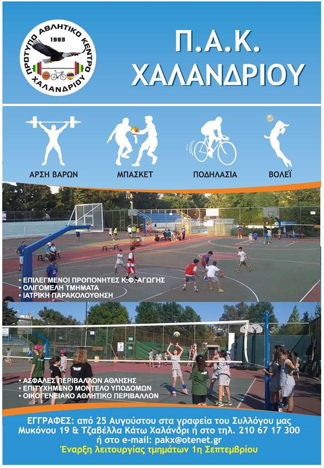Όσα παιδιά ενδιαφέρονται και επιθυμούν να εγγραφούν για πρώτη φορά στα τμήματα των Ακαδημιών μας και συγκεκριμένα στα αθλήματα του Μπάσκετ, του Βόλεϊ και της Άρσης Βαρών, μπορούν να επικοινωνούν στο τηλέφωνο: 210-6717300 και στο e-mail: Αυτή η διεύθυνση ηλεκτρονικού ταχυδρομείου προστατεύεται από τους αυτοματισμούς αποστολέων ανεπιθύμητων μηνυμάτων. Χρειάζεται να ενεργοποιήσετε τη JavaScript για να μπορέσετε να τη δείτε. ή να έρθουν σε προσωπική επικοινωνία μαζί μας, στο γραφείο του Συλλόγου μας, που βρίσκεται στη συμβολή των οδών Κυδωνίας 18 & Μεθώνης, Τ.Κ. 152 31 Χαλάνδρι, έναντι του κλειστού γυμναστηρίου «Μάρκος Παπαδάκης».