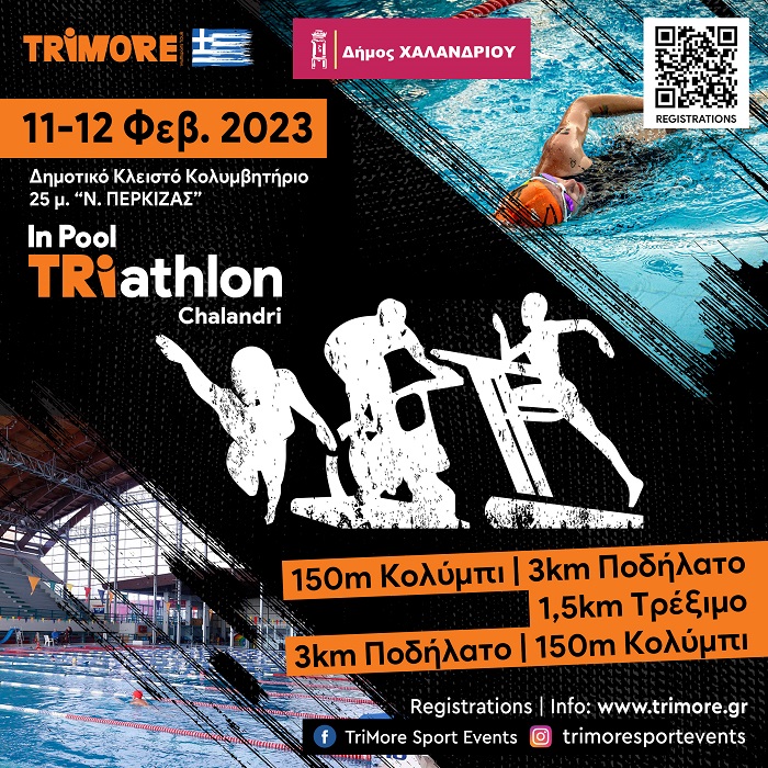 Ο Δήμος Χαλανδρίου φέρνει το πρώτο στην πόλη In Pool TRIathlon, το οποίο θα διοργανωθεί στο κολυμβητήριο του αθλητικού κέντρου «Νίκος Πέρκιζας», το σαββατοκύριακο 11-12 Φεβρουαρίου 2023. Τον αγώνα Τριάθλου διοργανώνει ο Δήμος Χαλανδρίου σε συνεργασία με την TRIMORE Sport Events.