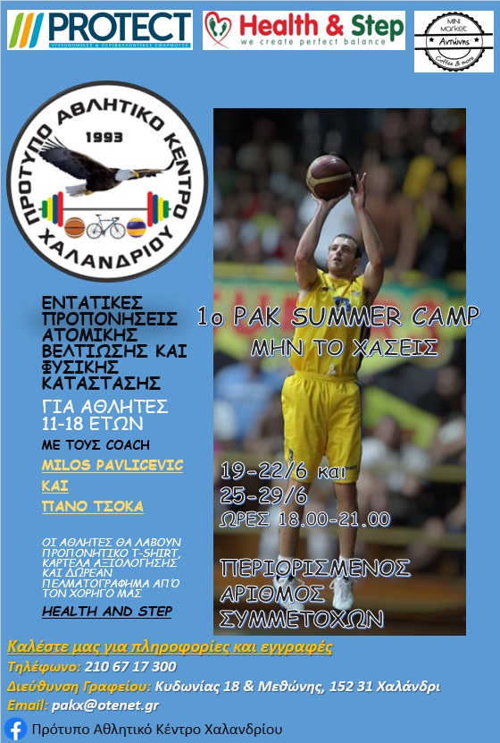 Σας ενημερώνουμε ότι στο πλαίσιο αναβάθμισης των υπηρεσιών μας θα πραγματοποιηθεί το πρώτο PAK Summer Camp σε δύο περιόδους (19-22/6 και 26-29/6) σε συνεργασία με τον Milos Pavlicevic!