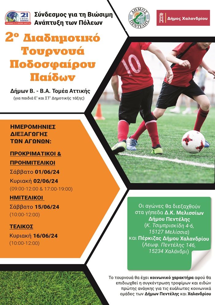 Ο Σύνδεσμος για τη Βιώσιμη Ανάπτυξη των Πόλεων (Σ.Β.Α.Π.) σε συνεργασία με τον Δήμο Πεντέλης και τον Δήμο Χαλανδρίου συνδιοργανώνουν το 2ο Διαδημοτικό Tουρνουά Ποδοσφαίρου Παίδων.