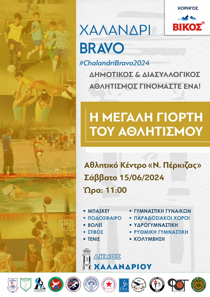 Όλο το αθλητικό Χαλάνδρι ενώνεται και γιορτάζει και φέτος στη μεγάλη γιορτή «Bravo 2024» που διοργανώνει για τρίτη συνεχόμενη χρονιά ο Δήμος Χαλανδρίου, στο Δημοτικό Αθλητικό Κέντρο «Νίκος Πέρκιζας», το Σάββατο 15 Ιουνίου 2024.