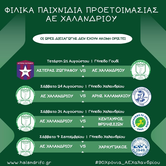 Η αντίστροφη μέτρηση για τους ποδοσφαιριστές της ΑΕ Χαλανδρίου έχει ξεκινήσει, καθώς τη Δευτέρα 5 Αυγούστου το γήπεδο του Χαλανδρίου “Ν. Πέρκιζας” θα ανοίξει τις πύλες του για να υποδεχτεί «παλιούς» και «νέους» για την έναρξη της νέας ποδοσφαιρικής χρονιάς 2024-2025.