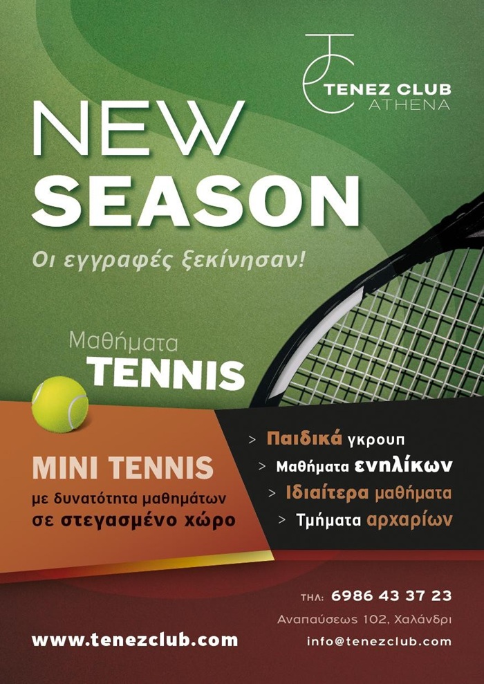 Η νέα αθλητική σεζόν ξεκινά! Το Tenez Club Athena ανακοινώνει την έναρξη των εγγραφών για την Ακαδημία Tennis με στόχο την εκμάθηση του αθλήματος ή τη βελτίωση του επιπέδου σας στις σύγχρονες αθλητικές εγκαταστάσεις του Club.