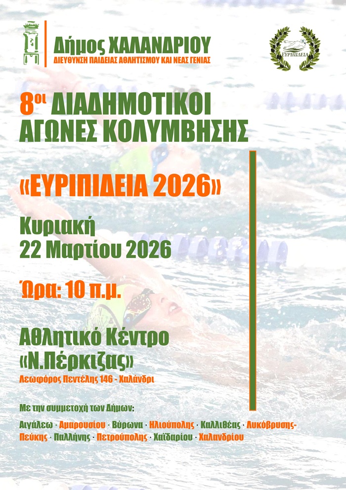 Για όγδοη συνεχή χρονιά, ο Δήμος Χαλανδρίου διοργανώνει τους Διαδημοτικούς Αγώνες Κολύμβησης, στο πλαίσιο των «Ευριπίδειων 2026».