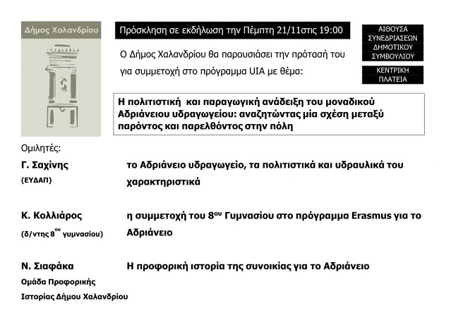 Συζήτηση για το σημαντικότερο μνημείο της αρχαιότητας στην πόλη του Χαλανδρίου, το Αδριάνειο υδραγωγείο, θα πραγματοποιηθεί την Πέμπτη 21 Νοεμβρίου 2019, στην αίθουσα συνεδριάσεων του Δημοτικού Συμβουλίου (Γρηγ. Γυφτόπουλου 2, κεντρική πλατεία Χαλανδρίου).