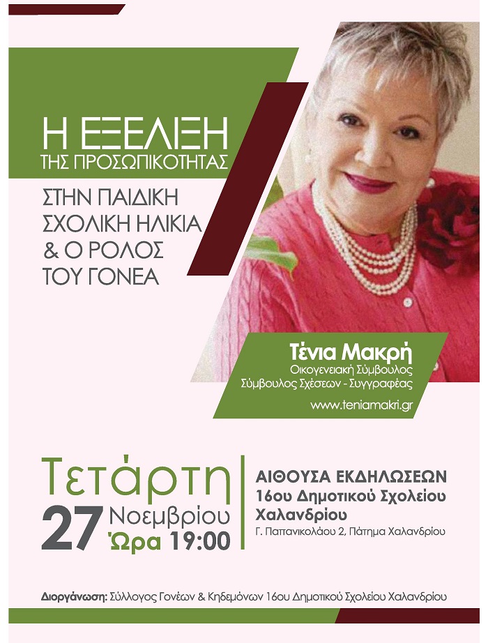 Ο Σύλλογος Γονέων και Κηδεμόνων του 16ου Δημοτικού Σχολείου Χαλανδρίου, στα πλαίσια του νέου κύκλου των εκπαιδευτικών και κοινωνικών δραστηριοτήτων του, διοργανώνει ενημερωτική ομιλία με θέμα: