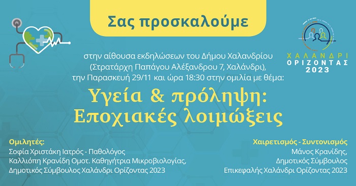 Η δημοτική παράταξη "Χαλάνδρι Ορίζοντας 2023" προσκαλεί στην εκδήλωση με θέμα "Υγεία και πρόληψη: Εποχιακές λοιμώξεις", που θα πραγματοποιηθεί την Παρασκευή 29 Νοεμβρίου 2019 και ώρα 18:30, στη αίθουσα εκδηλώσεων του Δήμου Χαλανδρίου (Στρ. Αλέξανδρου Παπάγου 7, Χαλάνδρι).