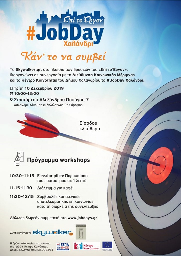 Το Skywalker.gr, στο πλαίσιο των δράσεών του «Επί το Έργον», διοργανώνει σε συνεργασία με τη Διεύθυνση Κοινωνικής Μέριμνας και το Κέντρο Κοινότητας του Δήμου Χαλανδρίου το #JobDay Χαλάνδρι.