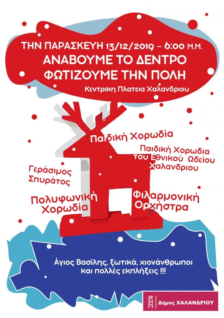 Τα λαμπιόνια θα ανάψουν παρουσία του δημάρχου Χαλανδρίου, Σίμου Ρούσσου, στις 6:00 το απόγευμα, με τις χριστουγεννιάτικες μελωδίες από τη Φιλαρμονική Ορχήστρα του Δήμου Χαλανδρίου, την Πολυφωνική Ορχήστρα, την Παιδική Χορωδία του Δήμου, τη χορωδία του Εθνικού Ωδείου «Μ. Κανατσούλη» καθώς και τον τραγουδιστή Γεράσιμο Σπυράτο, να σας κρατούν συντροφιά μέχρι το βράδυ.