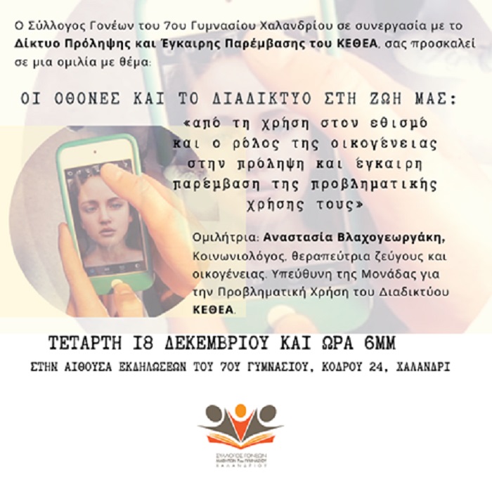 Ο Σύλλογος Γονέων του 7ου Γυμνασίου Χαλανδρίου σε συνεργασία με το Δίκτυο Πρόληψης και Έγκαιρης Παρέμβασης του ΚΕΘΕΑ, προσκαλεί την Τετάρτη 18 Δεκεμβρίου 2019 και ώρα 18:00 σε ομιλία με θέμα:
