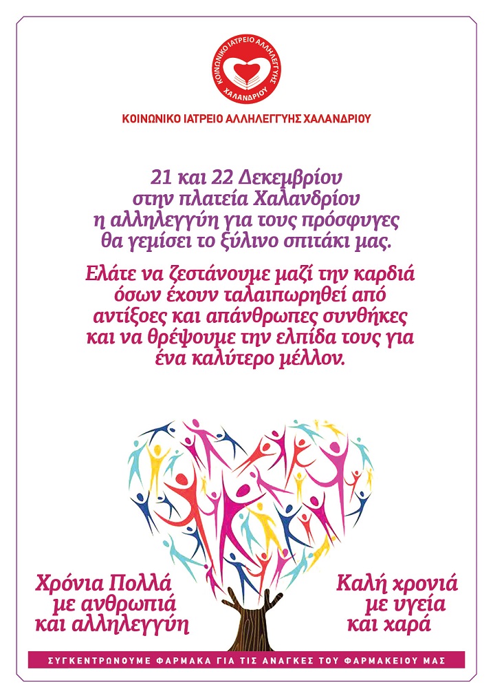 Το Κοινωνικό Ιατρείο Αλληλεγγύης Χαλανδρίου (συλλογικότητα αποτελούμενη από εθελοντές/ντριες χωρίς καμία χρηματοδότηση και εξάρτηση) πιστό στις αρχές του για παροχή βοήθειας σε οποιονδήποτε άνθρωπο έχει ανάγκη ανεξαρτήτως εθνότητας, φυλής ή φύλου, με σεβασμό στη διαφορετικότητα χωρίς διαχωριστικές γραμμές, θα βρίσκεται στο ξύλινο σπιτάκι που του παραχωρεί ο Δήμος στην πλατεία Χαλανδρίου, το Σάββατο 21 και την Κυριακή 22 Δεκεμβρίου 2019.