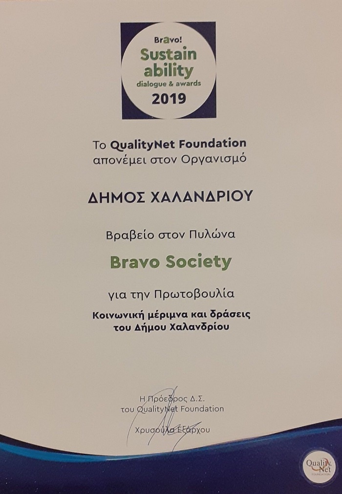 Για την Κοινωνική Μέριμνα και τις δράσεις του βραβεύτηκε ο Δήμος Χαλανδρίου στο πλαίσιο των βραβείων BRAVO από το Quality Net Foundation σε μια ιδιαίτερη εκδήλωση βράβευσης που πραγματοποιήθηκε την Τετάρτη 18 Δεκεμβρίου 2019 στο Μέγαρο Μουσικής Αθηνών.