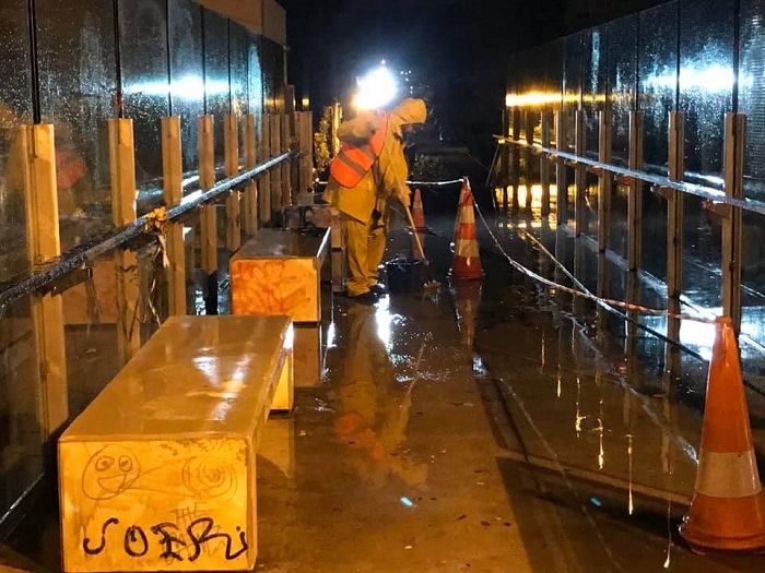Ο περιφερειάρχης Αττικής, Γιώργος Πατούλης βρέθηκε αργά το βράδυ της Κυριακής 22/12/2019 στην πεζογέφυρα του Κολλεγίου Αθηνών στη Λεωφόρο Κηφισιάς και παρακολούθησε από κοντά τις εργασίες καθαρισμού των Graffiti από τα παγκάκια και τις τζαμαρίες.