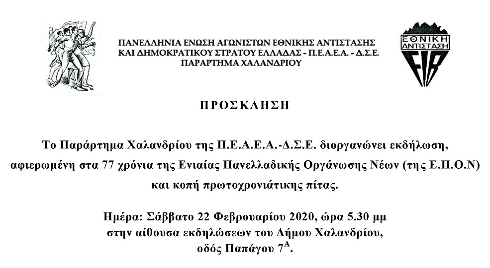 Το Παράρτημα Χαλανδρίου της Πανελλήνιας Ένωσης Αγωνιστών Εθνικής Αντίστασης και Δημοκρατικού Στρατού Ελλάδας προσκαλεί στην εκδήλωση που θα πραγματοποιήσει, αφιερωμένη στα 77 χρόνια από την ίδρυση της Ενιαίας Πανελλαδικής Οργάνωσης Νέων (της Ε.Π.Ο.Ν.), και στην κοπή της πρωτοχρονιάτικης πίτας του Παραρτήματος.