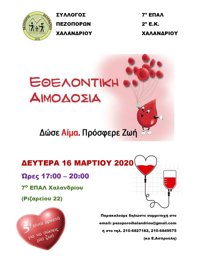 Οι μαθητές και οι Πεζοπόροι καλούν τους συλλόγους, τους φίλους και όλους τους πολίτες του Χαλανδρίου να δώσουν το παρών προσφέροντας λίγο από το αίμα τους και ενισχύοντας τη δράση των μαθητών του σχολείου και του Συλλόγου Πεζοπόρων.