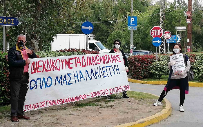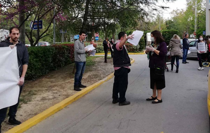 Με πανό, αφίσες, πικέτες, ντουντούκα και ανακοινώσεις απευθύνθηκαν στους εργαζόμενους του χώρου αλλά και τους καταναλωτές, βροντοφωνάζοντας το σύνθημα «Στην πανδημία δεν μένουμε εκτεθειμένοι! Διεκδικούμε άμεσα μέτρα προστασίας και υγείας!».