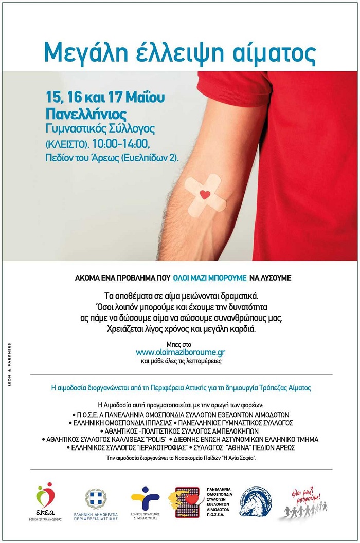 Εθελοντική αιμοδοσία οργανώνει η Περιφέρεια Αττικής το τριήμερο 15, 16 και 17 Μαΐου 2020 και ώρες 10:00-14:00, στον Πανελλήνιο Γυμναστικό Σύλλογο, που βρίσκεται στο Πεδίον του Άρεως (Ευελπίδων 2).