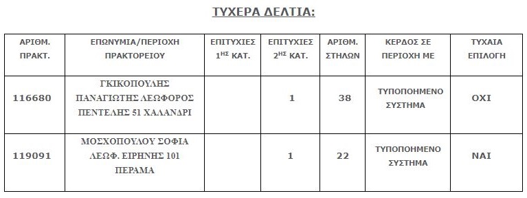 Το ένα από τα δύο τυχερά δελτία της 2ης κατηγορίας (5άρια) κατατέθηκε στο πρακτορείο ΟΠΑΠ του κ. ΠΑΝΑΓΙΩΤΗ ΓΚΙΚΟΠΟΥΛΗ στο Χαλάνδρι (Λεωφ. Πεντέλης 51), με τυποποιημένο σύστημα 38 στηλών. Μήπως είστε εσείς ο τυχερός ή η τυχερή;
