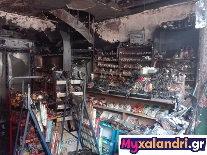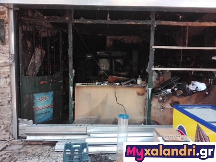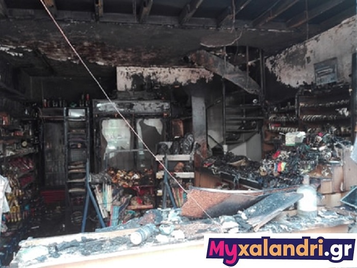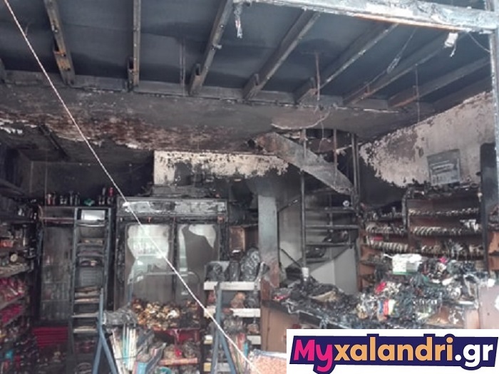 Οι αποκλειστικές φωτογραφίες του Myxalandri.gr αποτυπώνουν το μέγεθος της καταστροφής. Η πυρκαγιά επεκτάθηκε και στο πατάρι του καταστήματος.
