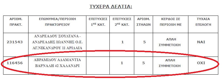 Το ένα από τα δύο τυχερά δελτία της 2ης κατηγορίας (5άρια) κατατέθηκε στο πρακτορείο ΟΠΑΠ της κ. Αβραμίδου Αδαμαντίας στο Χαλάνδρι (Βάρναλη 42), με απλή συμμετοχή 5 στηλών, αξίας 2,50€. Σε επικοινωνία του Myxalandri.gr με την ιδιοκτήτρια του πρακτορείου, μας ενημέρωσε ότι ο/η τυχερός/ή δεν έχει εμφανιστεί ακόμα. Μήπως είστε εσείς;