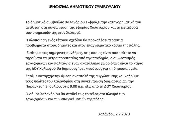 Είναι μονόδρομος για εμάς ως "Χαλάνδρι σε Δράση", να στηρίξουμε το ψήφισμα του Δημοτικού Συμβουλίου Χαλανδρίου και φορέων της πόλης μας, όπως ο Εμπορικός Σύλλογος, για συμπαράσταση στις δίκαιες διαμαρτυρίες των εργαζομένων της Δ.Ο.Υ. Χαλανδρίου, ώστε να παραμείνει η Δ.Ο.Υ. Χαλανδρίου στον φυσικό της χώρο το Χαλάνδρι.