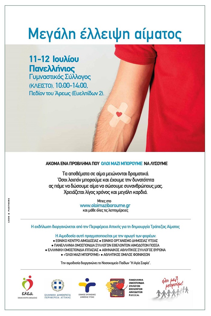 Εθελοντική αιμοδοσία διοργανώνει η Περιφέρεια Αττικής το Σάββατο 11 και την Κυριακή 12 Ιουλίου 2020, από τις 10:00 το πρωί μέχρι τις 2:00 το μεσημέρι, στον Πανελλήνιο Γυμναστικό Σύλλογο που βρίσκεται στο Πεδίον του Άρεως (Ευελπίδων 2).
