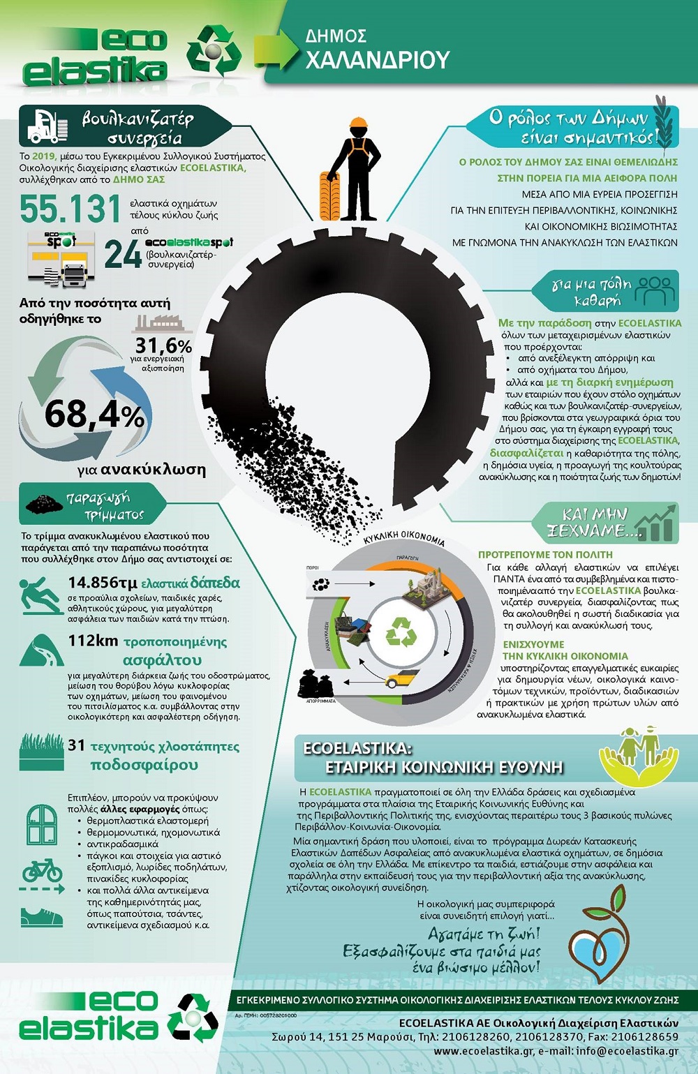 Σύμφωνα με αυτά, συλλέχθηκαν από τον Δήμο Χαλανδρίου 55.131 ελαστικά οχημάτων από τα 24 βουλκανιζατέρ/συνεργεία που έχουν ενταχθεί στο σύστημα Ecoelastika και από το συνεργείο του Δήμου. Η ποσότητα που συνέλεξε το συνεργείο του Δήμου Χαλανδρίου αντιστοιχεί σε 1,95 τόνο ελαστικών.
