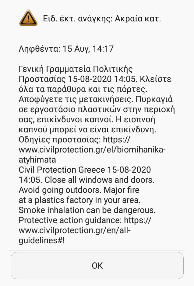 Προειδοποιητικό μήνυμα από τη Γενική Γραμματεία Πολιτικής Προστασίας μέσω του Ευρωπαϊκού Αριθμού Κλήσης Εκτάκτων Αναγκών 112 έλαβαν κάτοικοι περιοχών της Αττικής, προκειμένου να λάβουν μέτρα για να προστατευθούν από τις τοξικές επιπτώσεις και τα προβλήματα από τον καπνό που δημιουργήθηκαν από την πυρκαγιά στο εργοστάσιο ανακύκλωσης πλαστικών στη Μεταμόρφωση. Μήνυμα από το 112 έλαβαν και κάτοικοι του Χαλανδρίου.