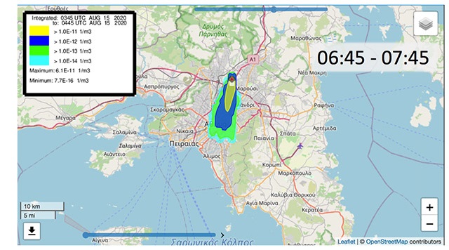 Αμέσως μετά την έναρξη της πυρκαγιάς μεταξύ 06:45-07:45 βλέπουμε ότι το κέντρο της Αθήνας δέχθηκε μεγάλες ποσότητες αερολυμάτων (κίτρινες και μπλε αποχρώσεις), ενώ στη συνέχεια μέχρι το μεσημέρι και τα νότια προάστια της Αθήνας είχαν σκεπαστεί από το πυκνό νέφος.
