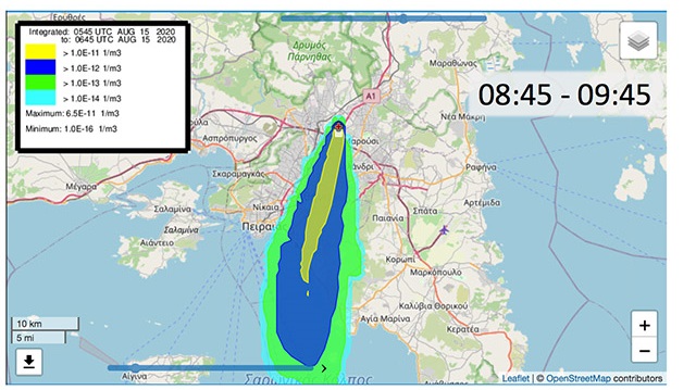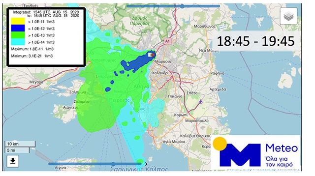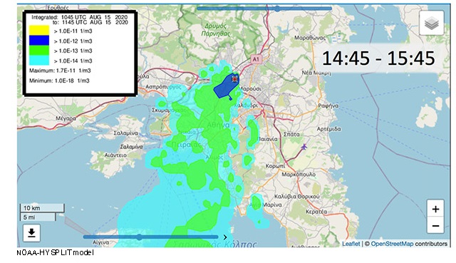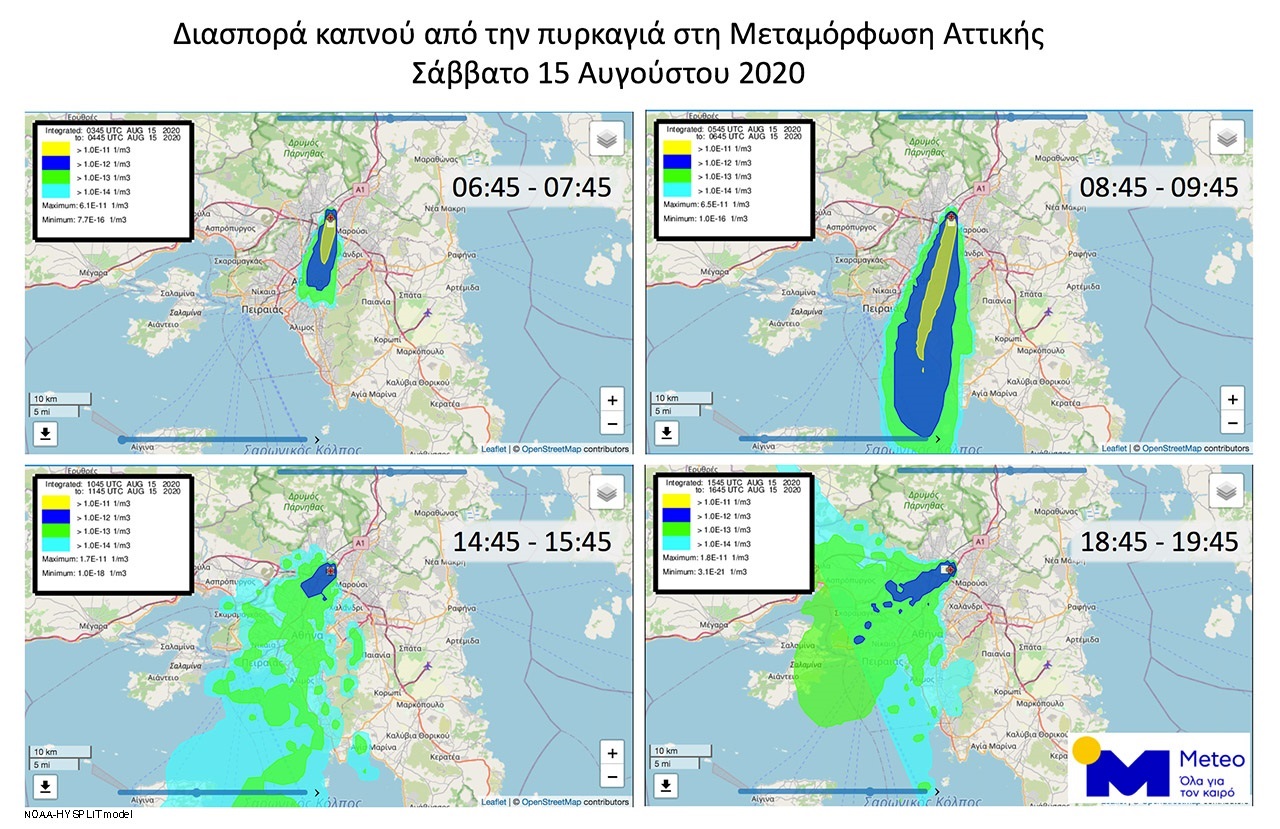 Εικόνες και μοντελοποίηση της διασποράς καπνού της πυρκαγιάς στη Μεταμόρφωση Αττικής - 15/08/2020: