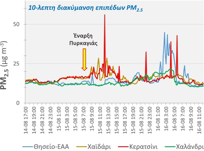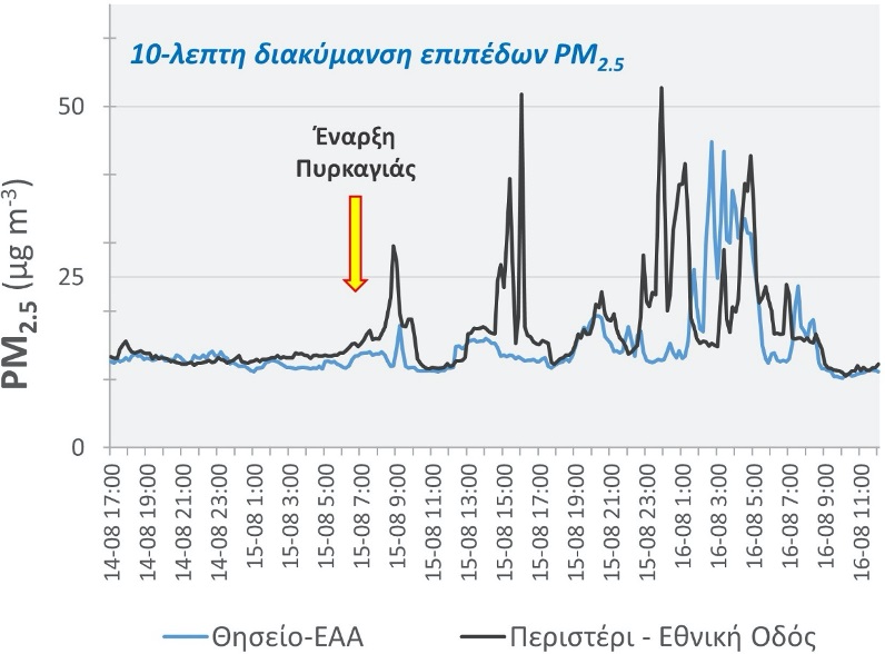 Από τα στοιχεία του δικτύου αισθητήρων του Ινστιτούτου Ερευνών Περιβάλλοντος του Εθνικού Αστεροσκοπείου Αθηνών (ΙΕΠΒΑ/ΕΑΑ), που λειτουργεί στο πλαίσιο της Εθνικής Ερευνητικής Υποδομής ΠΑΝΑΚΕΙΑ, προκύπτει σχετικά με τα επίπεδα συγκεντρώσεων λεπτών αιωρούμενων σωματιδίων PM2.5 στο Λεκανοπέδιο της Αττικής, κατά την 15η - 16η Αυγούστου 2020, ότι: