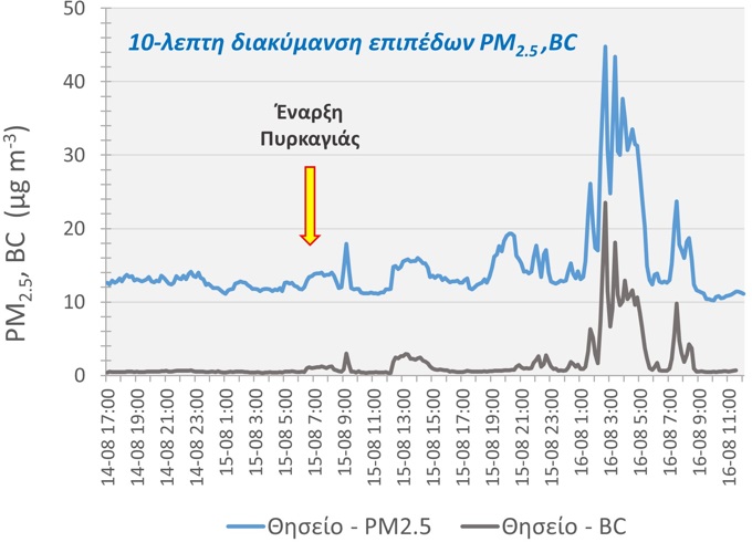 - Σε αυτό το χρονικό διάστημα η μέση συγκέντρωση των αιωρούμενων σωματιδίων κυμάνθηκε περίπου στα 30 μικρογραμμάρια ανά κυβικό μέτρο, ενώ η αντίστοιχη συγκέντρωση σε μαύρο άνθρακα (BC), χαρακτηριστικό δείκτη ατελούς καύσης, ήταν ιδιαίτερα αυξημένη με μέση τιμή τα 9 μικρογραμμάρια ανά κυβικό μέτρο.