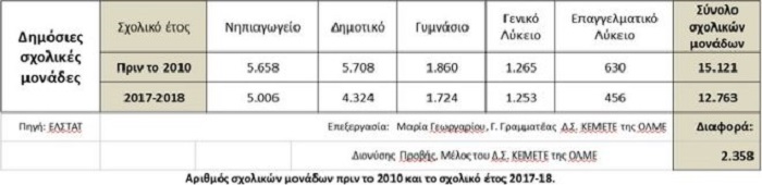 Β) Η δεύτερη πηγή είναι τα σχολεία που καταργήθηκαν ή συγχωνεύθηκαν την περίοδο των μνημονίων. Στον παρακάτω πίνακα βλέπουμε ότι πριν τα μνημόνια υπήρχαν 2.358 επιπλέον δημόσιες σχολικές μονάδες. Κάποιες από αυτές, μπορούν να φιλοξενήσουν μαθητές την ερχόμενη σχολική χρονιά, ώστε να γίνει ο χωρισμός των τμημάτων. Εδώ χρειάζεται η κατάλληλη προετοιμασία εκ μέρους της Πολιτείας. Το καλοκαίρι αυτό, ήταν αρκετό για την εκπόνηση ενός σχεδίου επαναλειτουργίας των σχολικών μονάδων από το Υπουργείο. Δυστυχώς όμως, ο χρόνος που χάθηκε είναι δύσκολο πλέον να καλυφθεί.
