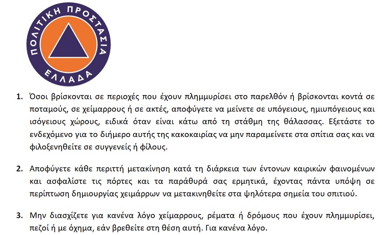 1. Αποφεύγουμε να μείνουμε σε υπόγειους, ημιυπόγειους και ισόγειους χώρους. Εξετάζουμε το ενδεχόμενο το διήμερο αυτό να μετακινηθούμε σε σπίτια συγγενών ή φίλων.