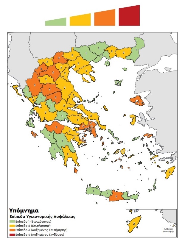 Ενεργοποιούμε στην ιστοσελίδα covid19.gov.gr τον Χάρτη Υγειονομικής Ασφάλειας και Προστασίας από τη λοίμωξη Covid-19, που περιλαμβάνει τέσσερα επίπεδα προληπτικών μέτρων και κανόνων για κάθε Περιφερειακή Ενότητα της χώρας: