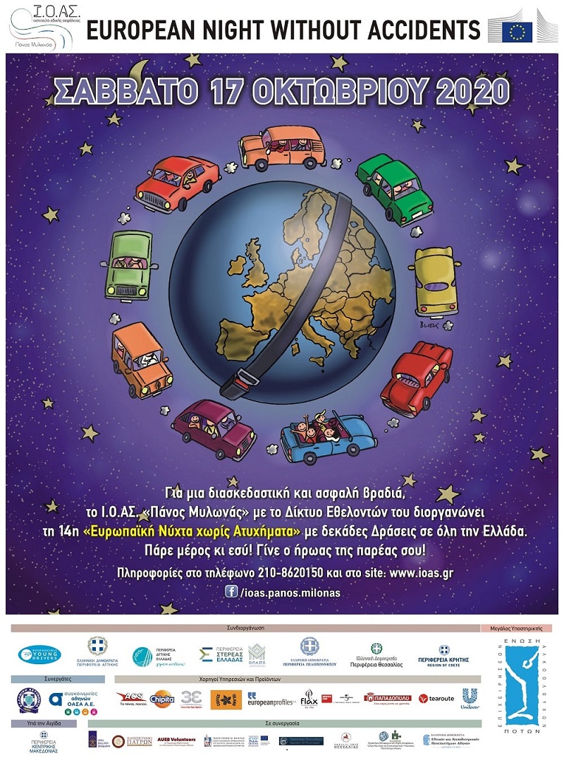 Το Ινστιτούτο Οδικής Ασφάλειας (Ι.Ο.ΑΣ.) «Πάνος Μυλωνάς» διοργανώνει, το Σάββατο 17 Οκτωβρίου 2020 την «14η Ευρωπαϊκή Νύχτα χωρίς Ατυχήματα» σε 34 μεγάλες πόλεις στην Ελλάδα. Ο κεντρικός της άξονας είναι ότι «αλκοόλ και οδήγηση δεν πάνε μαζί» ενώ το μήνυμά στην Ελλάδα είναι η προτροπή, στις παρέες, να ορίσουν ένα άτομο που δεν θα καταναλώσει ποτό εκείνη τη βραδιά και θα αναλάβει τον ρόλο του «οδηγού της παρέας»!
