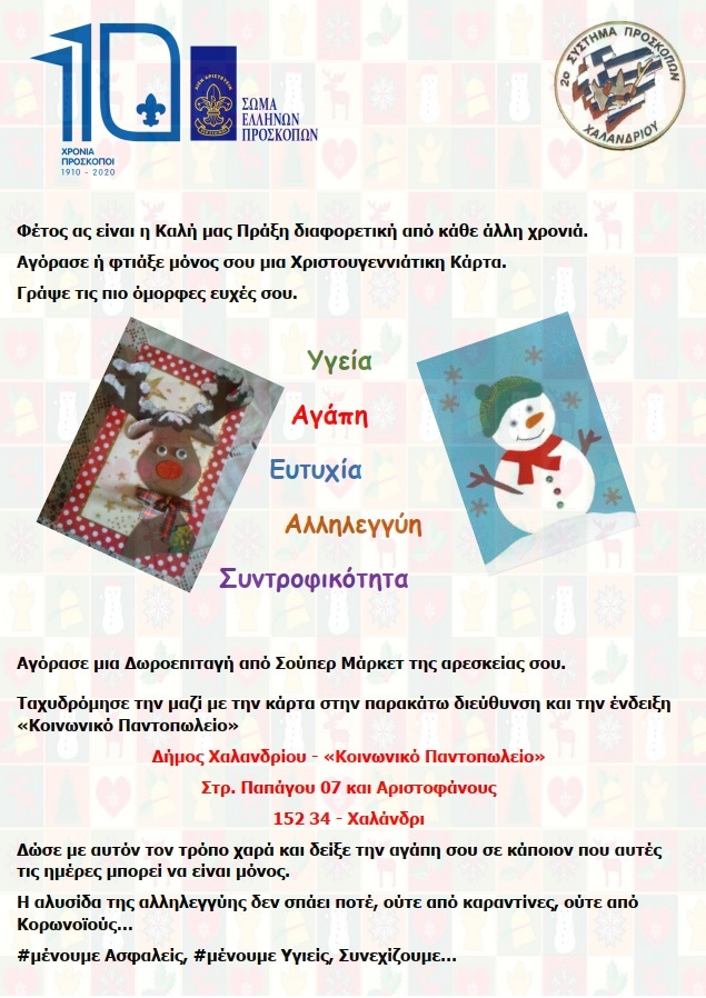 Το 2ο Σύστημα Προσκόπων παρακινεί τα μέλη του και όλους τους κατοίκους της πόλης να δημιουργήσουν μια ευχετήρια κάρτα και μαζί μια δωροεπιταγή από super market της περιοχής τους και να την στείλουν στο Κοινωνικό Παντοπωλείο του Δήμου Χαλανδρίου. Η πρόσκληση συνοδεύεται από το μήνυμα, «η αλυσίδα της αλληλεγγύης δεν σπάει ποτέ, ούτε από καραντίνες, ούτε από κορωνοϊούς».
