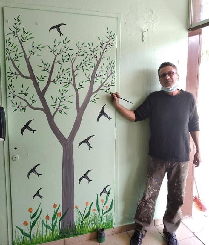 “Ο καλλιτέχνης των Αγράφων” έφτιαξε μέσα σε αίθουσα στο 12ο Δημοτικό Σχολείο Χαλανδρίου, κατόπιν συνεννόησης με γονείς και δασκάλους, μια τοιχογραφία με το δέντρο της ειρήνης (την ελιά), τουλίπες και χελιδόνια, που όπως αναφέρει, «σε άλλη διάσταση μετά αλλάζουν χρώματα και πηγαίνουν προς τον Ήλιο! Στα παιδιά αρέσει πολύ και με αυτό τον τρόπο μαθαίνουν να σκέφτονται και να καταλαβαίνουν τη διαφορά, το φυσικό και το χρωματιστό, την κίνηση σε άλλη διάσταση».