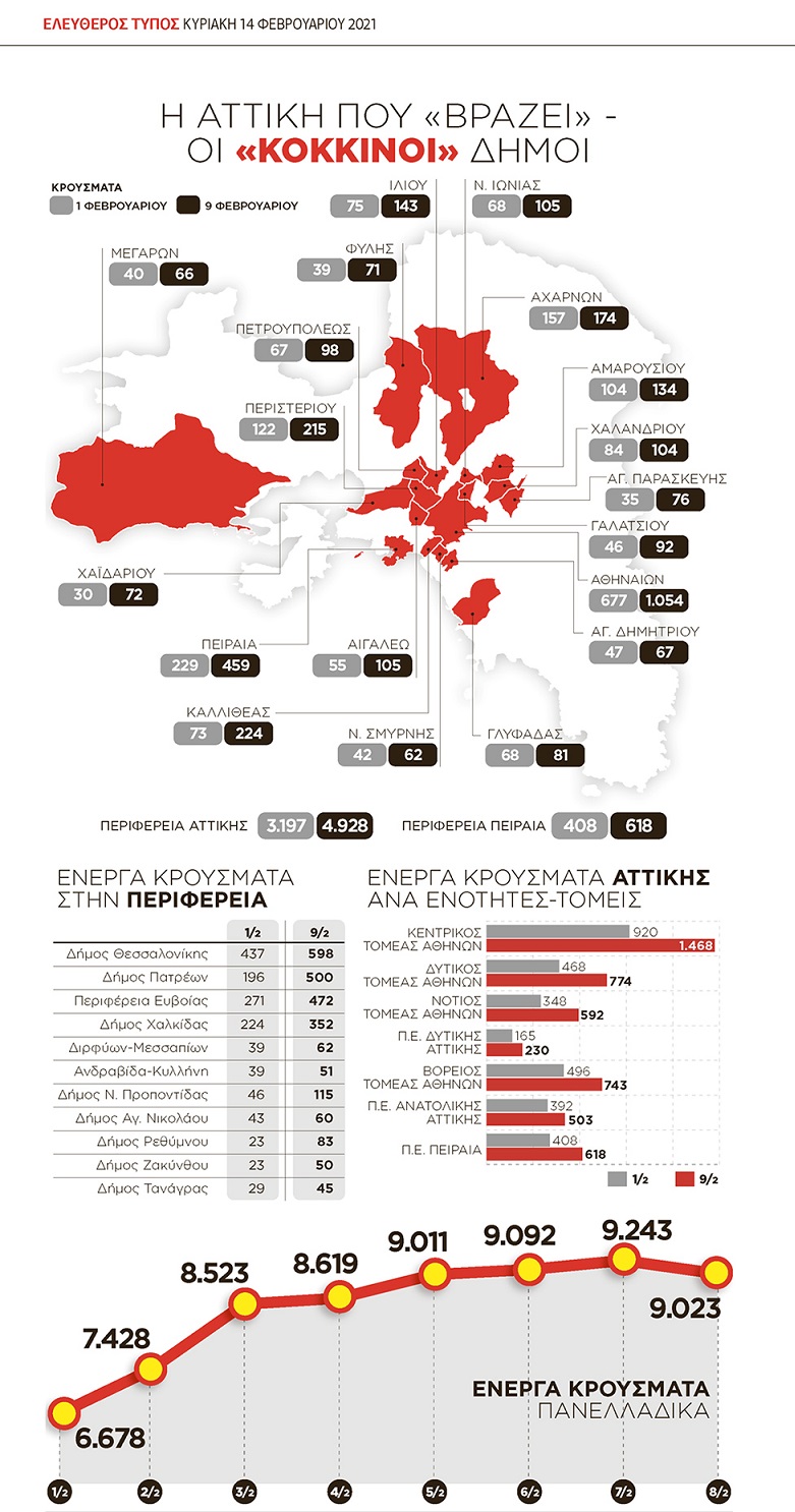 Τα 4.797 ενεργά κρούσματα σε όλη τη χώρα στις 26 Ιανουαρίου, την 1η Φεβρουαρίου έφθασαν τα 6.678 και εκτινάχθηκαν στα 9.023 στις 9 Φεβρουαρίου, με πάνω από τα μισά να είναι στην Αττική. Ο Ελεύθερος Τύπος της Κυριακής αποκαλύπτει κάποια από τα αριθμητικά δεδομένα που εξέτασε η επιτροπή, αναδεικνύοντας τις «κόκκινες» επιδημιολογικά περιφερειακές ενότητες και δήμους της Αττικής.