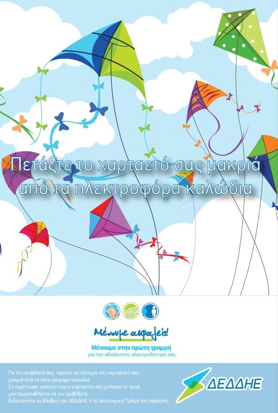 Ο Διαχειριστής Ελληνικού Δικτύου Διανομής Ηλεκτρικής Ενέργειας (ΔΕΔΔΗΕ), ιδιαίτερα υπό την παρούσα συγκυρία και με δεδομένο τον περιορισμό των μετακινήσεων των πολιτών πλησίον της οικίας τους, σας συμβουλεύει να μην πετάτε τον χαρταετό σας κοντά σε ηλεκτροφόρα καλώδια, καθώς υπάρχει σοβαρός κίνδυνος ηλεκτροπληξίας για εσάς και διακοπής της παροχής ρεύματος στη γύρω περιοχή.