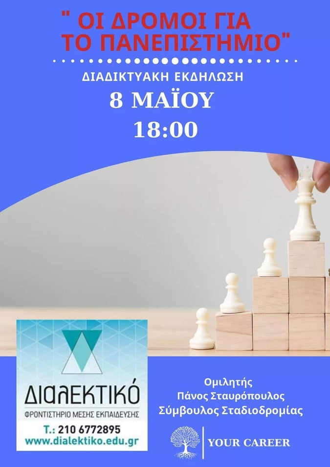 Ο Εκπαιδευτικός μας Οργανισμός δίπλα πάντα στους μαθητές και στις αγωνίες του διοργανώνει webinar σταδιοδρομίας το Σάββατο 8 Μαΐου στις 18:00, στο οποίο ο σύμβουλος σταδιοδρομίας Πάνος Σταυρόπουλος, ιδρυτής της εταιρίας επαγγελματικής συμβουλευτικής YOUR CAREER, θα μας πληροφορήσει για τον Ακαδημαϊκό Χάρτη και τις προοπτικές που ανοίγονται.