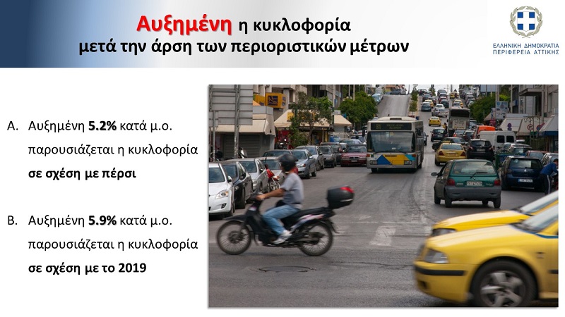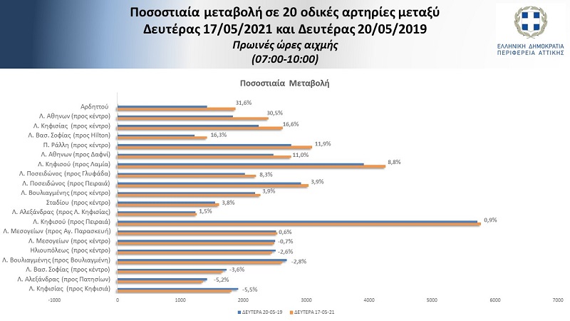 Αυξημένη κατά περίπου 5.5%, κατά μέσο όρο, παρουσιάζεται η κυκλοφορία τις πρωινές ώρες αιχμής σε 20 κεντρικούς δρόμους της Αττικής, μετά την άρση των περιοριστικών μέτρων, σε σχέση με την αντίστοιχη περίοδο το 2020 και το 2019