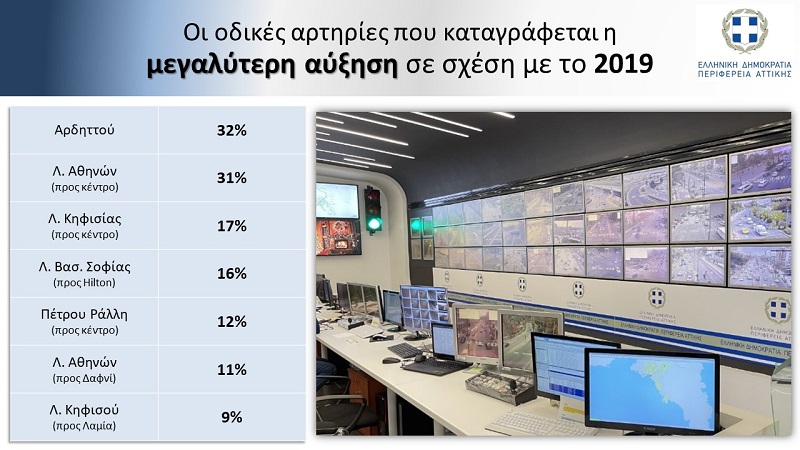 Αύξηση της κυκλοφορίας που σε κάποιες περιπτώσεις, σε σχέση με την αντίστοιχη περίοδο το 2020 και το 2019, ξεπερνά και το 50% σε 20 κεντρικούς οδικούς άξονες της Αττικής, κατέγραψε το Κέντρο Διαχείρισης Κυκλοφορίας της Περιφέρειας Αττικής, σε πρωινές ώρες αιχμής, μετά την άρση των περιοριστικών μέτρων.
