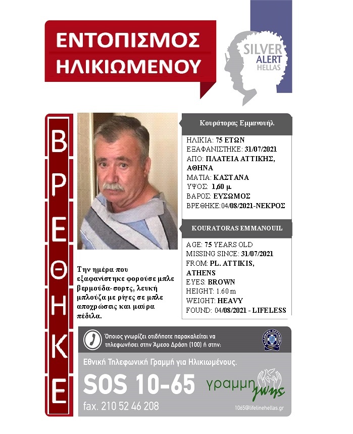 Η ΓΡΑΜΜΗ ΖΩΗΣ, ειδοποιήθηκε από τους οικείους του το βράδυ της 02/08/2021 και μετά τη συγκέντρωση των απαιτούμενων δικαιολογητικών, ενεργοποίησε τον Κοινωνικό Συναγερμό SILVER ALERT, για την κινητοποίηση όλων για την ανεύρεσή του.