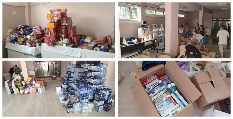 Συγκεντρώθηκαν τρόφιμα μακράς διαρκείας, βρεφικά είδη, είδη προσωπικής υγιεινής, υγειονομικό υλικό και τροφές και γατιά και σκυλιά. Εξίσου συγκινητική η συνδρομή των περίπου 30 εθελοντών -όλοι νέα παιδιά- που μια ολόκληρη ημέρα, το Σάββατο 7 Αυγούστου, ξεχώρισαν, ταξινόμησαν και πακετάρισαν όλα τα είδη ξεχωριστά.