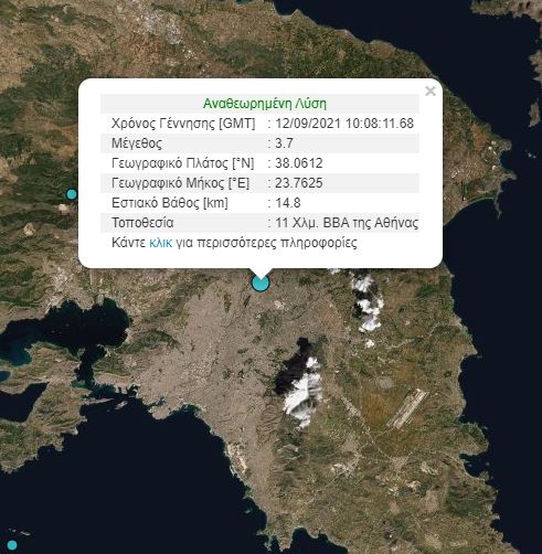 Σεισμική δόνηση μεγέθους 3,7 βαθμών της κλίμακας Ρίχτερ σημειώθηκε στις 13:08 το μεσημέρι της Κυριακής, με το επίκεντρο να εντοπίζεται 11 χλμ. Βόρεια - Βορειοανατολικά της Αθήνας, σύμφωνα με το Γεωδυναμικό Ινστιτούτο του Εθνικού Αστεροσκοπείου Αθηνών.