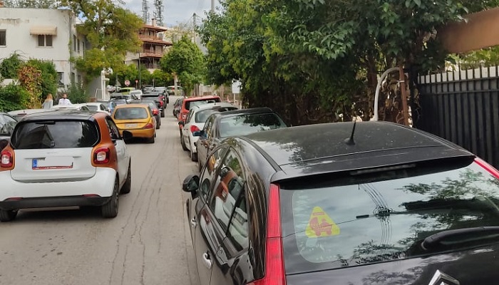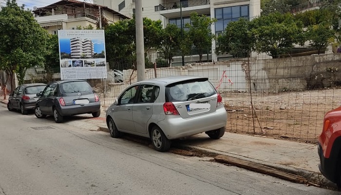 Απροσπέλαστο πεζοδρόμιο για μητέρα με παιδί στην Ηρώδου Αττικού στο Χαλάνδρι