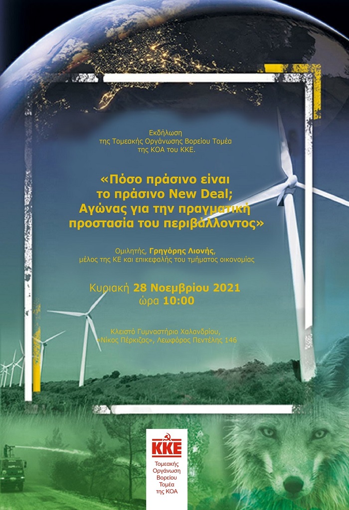 H Tομεακή Οργάνωση Βορείου Τομέα της ΚΟΑ του ΚΚΕ διοργανώνει εκδήλωση με θέμα «Πόσο πράσινο είναι το πράσινο New Deal; Αγώνας για την πραγματική προστασία του περιβάλλοντος», την Κυριακή 28 Νοεμβρίου 2021 και ώρα 10:00 π.μ., στο κλειστό Γυμναστήριο Χαλανδρίου "Νίκος Πέρκιζας" (Λεωφ. Πεντέλης 146).