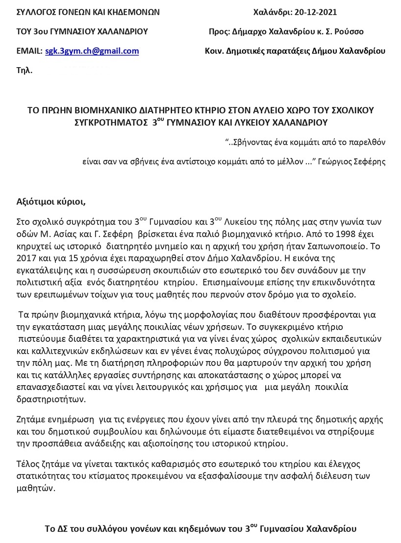 Επιστολή προς τον Δήμο Χαλανδρίου απέστειλε ο Σύλλογος Γονέων και Κηδεμόνων του 3ου Γυμνασίου Χαλανδρίου, σχετικά με το πρώην βιομηχανικό διατηρητέο κτήριο που βρίσκεται στον αύλειο χώρο του σχολικού συγκροτήματος του 3ου Γυμνασίου και 3ου Λυκείου Χαλανδρίου.